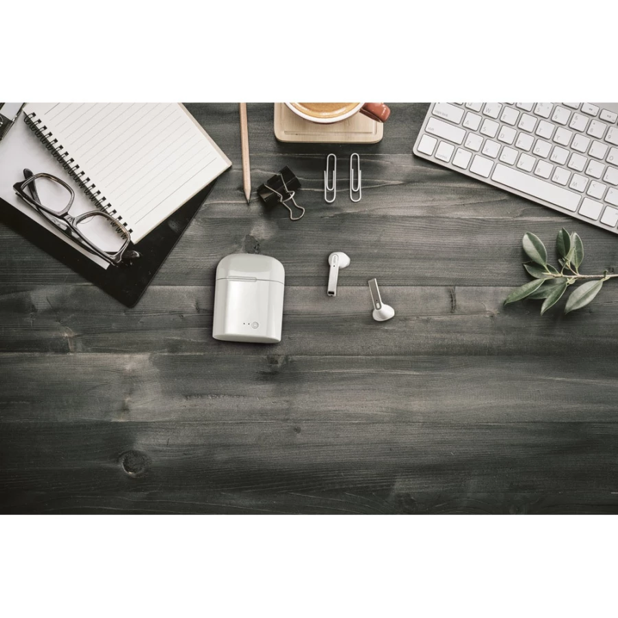 Bezprzewodowe słuchawki stereo wykonane z ABS. Transmisja BT z autonomią do 6 godzin. Te słuchawki mogą odbierać połączenia, regulować głośność i łączyć się z listą odtwarzania na urządzeniu mobilnym. Dołączony kabel USB do ładowania. Dostarczany w pudełku z funkcją ładowarki. 71 x 55 x 28 mm | Słuchawki: 47 x 21 x 21 mm