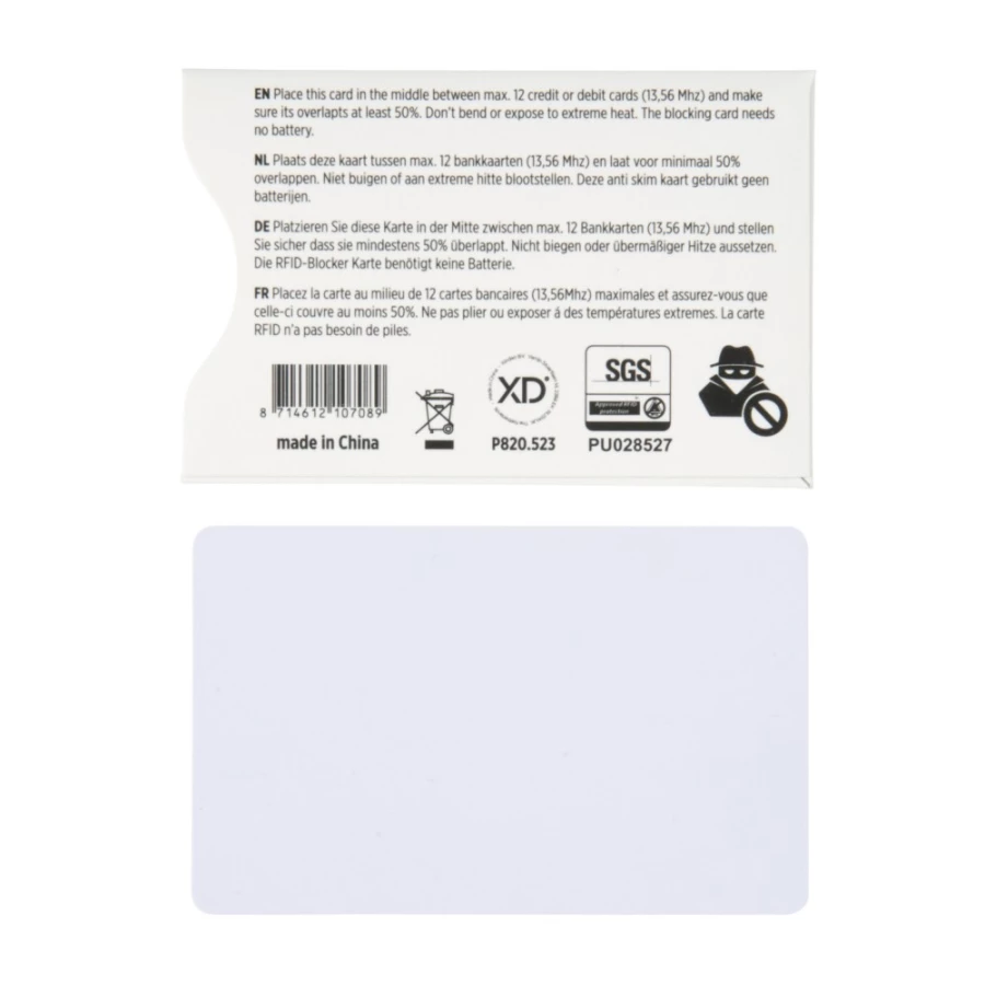 Karta do portfela z ochroną RFID, pobiera energię ze skanerów NFC/RFID do wytworzenia pola elektronicznego, dzięki któremu wszystkie karty 13,56 MHz stają się niewidoczne dla skanerów, nie wymaga używania baterii, opatentowana technologia E-FIELD z ochroną 24/7 przed elektroniczną kradzieżą, ślad węglowy produktu: 0,1 kg CO2