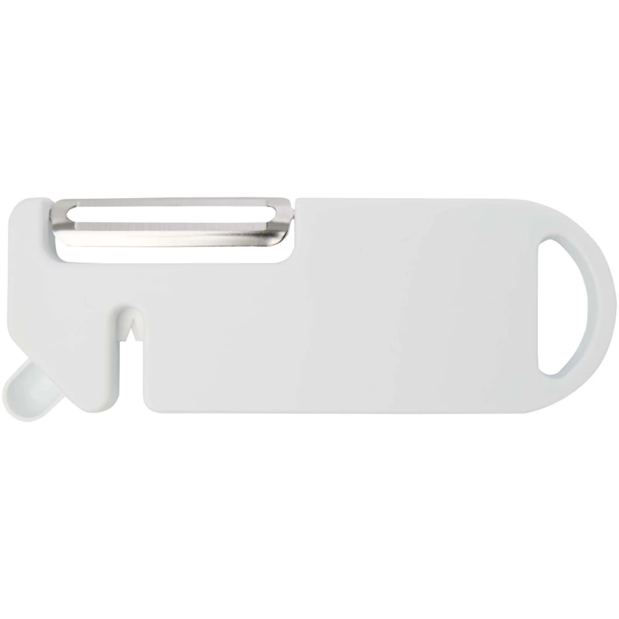 To wielofunkcyjne narzędzie kuchenne łączy w sobie cztery podstawowe funkcje w jednej kompaktowej konstrukcji. Wykonane z tworzyw sztucznych pochodzących z recyklingu, zawiera obieraczkę, otwieracz do butelek, ostrzałkę do noży i spiczastą końcówkę do usuwania oczek z ziemniaków. Wbudowany otwór do zawieszania umożliwia łatwe przechowywanie. Praktyczne i oszczędzające miejsce, jest uniwersalnym, niezbędnym gadżetem każdego domowego kucharza.