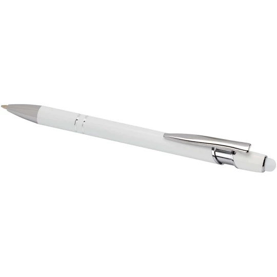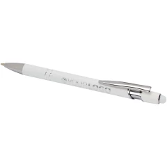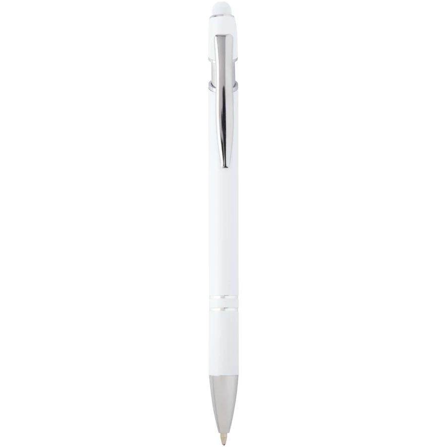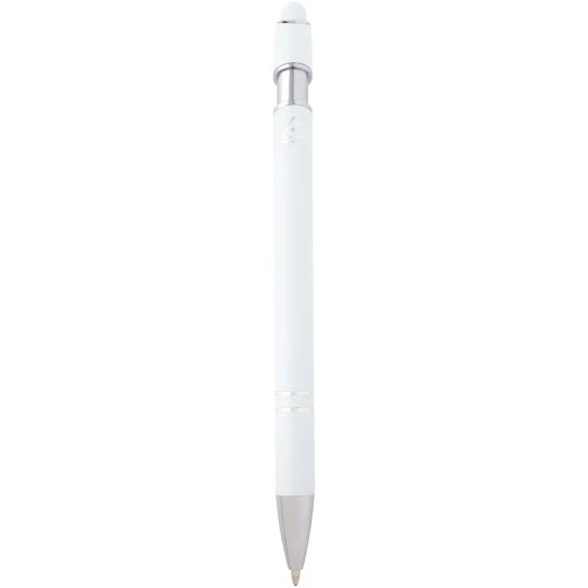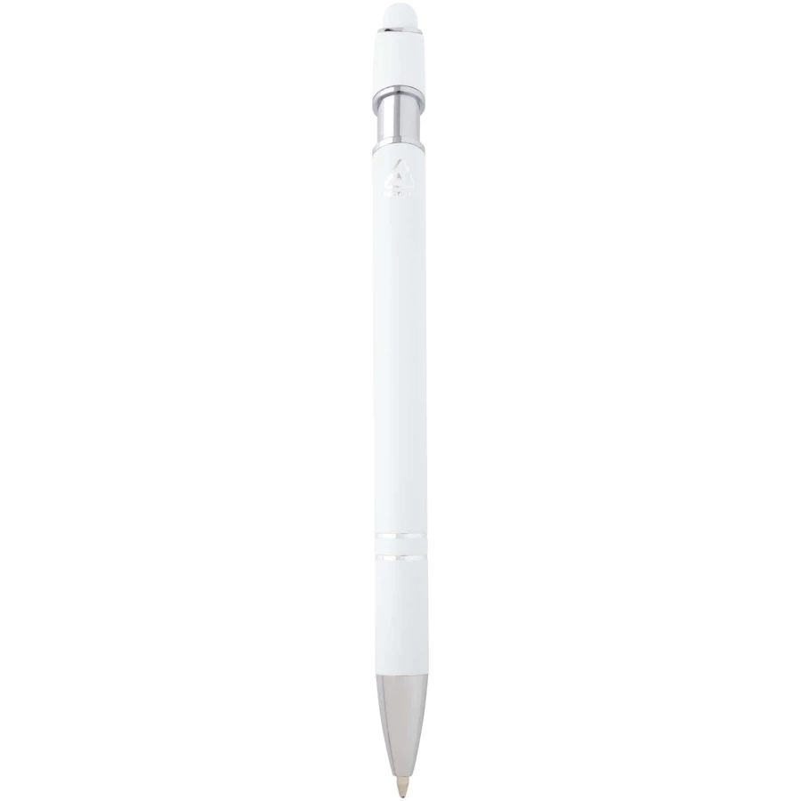 Długopis Kish ze srebrnym wykończeniem ma korpus wykonany z aluminium z recyklingu i rysik dotykowy wykonany z silikonu. Aluminium z recyklingu ogranicza ilość odpadów na wysypiskach śmieci i pomaga chronić zasoby naturalne w celu zmniejszenia emisji gazów cieplarnianych. Kolor tuszu: Niebieski. Żywotność: 800 metrów. Rozmiar stalówki: 1,0 mm.