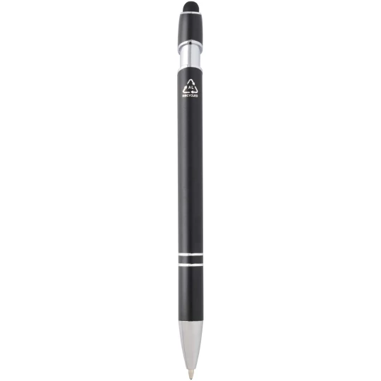 Długopis Kish ze srebrnym wykończeniem ma korpus wykonany z aluminium z recyklingu i rysik dotykowy wykonany z silikonu. Aluminium z recyklingu ogranicza ilość odpadów na wysypiskach śmieci i pomaga chronić zasoby naturalne w celu zmniejszenia emisji gazów cieplarnianych. Kolor tuszu: Niebieski. Żywotność: 800 metrów. Rozmiar stalówki: 1,0 mm.