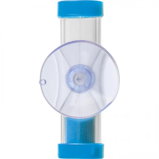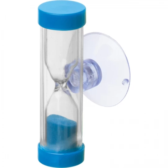 Mała klepsydra wypełniona kolorowym piaskiem, jedno przesypanie się piasku trwa 3 minuty.