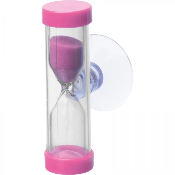 Mała klepsydra wypełniona kolorowym piaskiem, jedno przesypanie się piasku trwa 3 minuty.