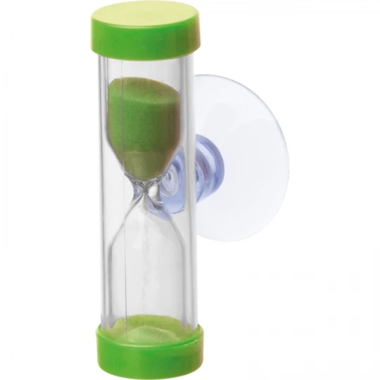 Mała klepsydra wypełniona kolorowym piaskiem, jedno przesypanie się piasku trwa 3 minuty.