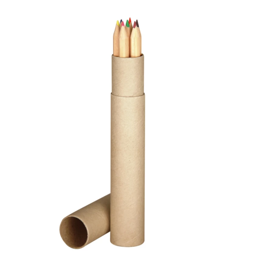 7 długich drewnianych kredek w okrągłym kartonowym pudełku.