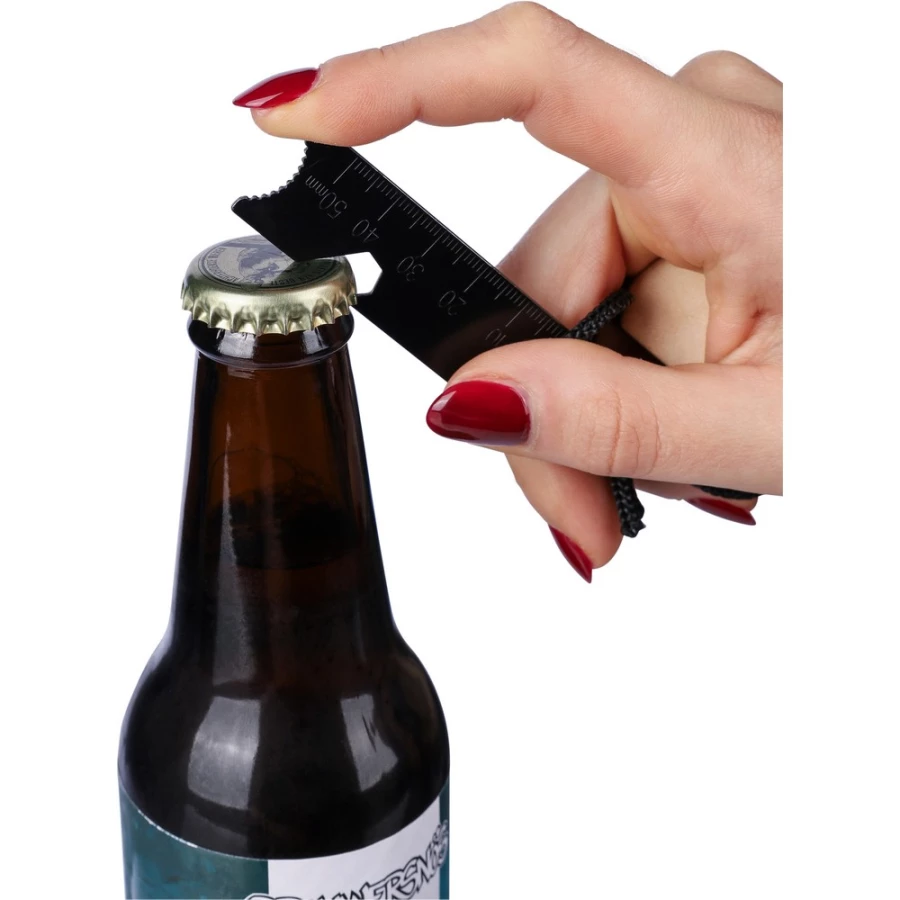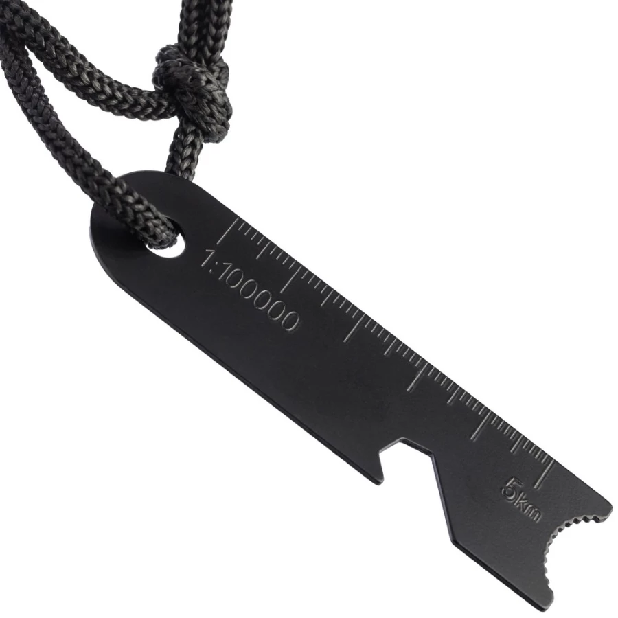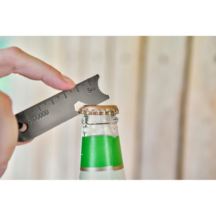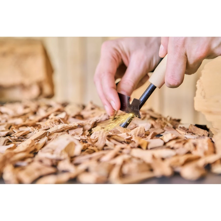 Wielofunkcyjne narzędzie, funkcje: krzesiwo, skrobak, otwieracz do butelek, klucz sześciokątny, sznurek ułatwiający noszenie zapakowane w brązowe kartonowe pudełko, produkt wykonany z metalu i drewna sosnowego