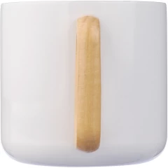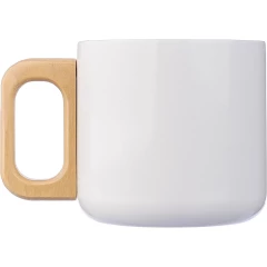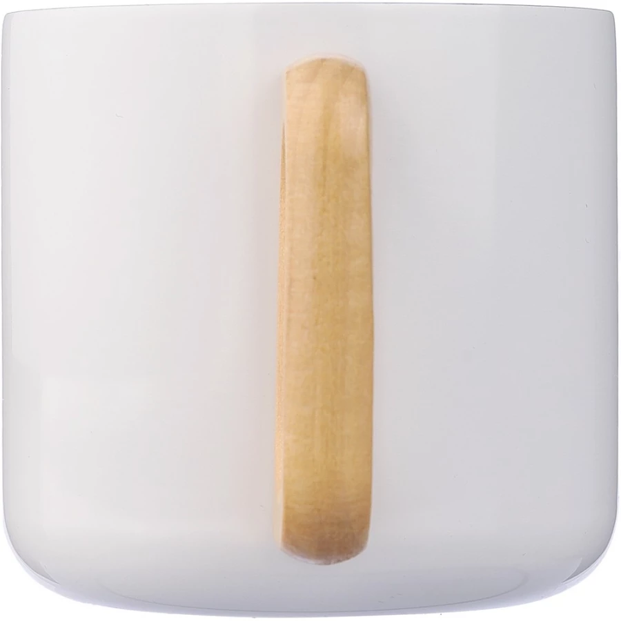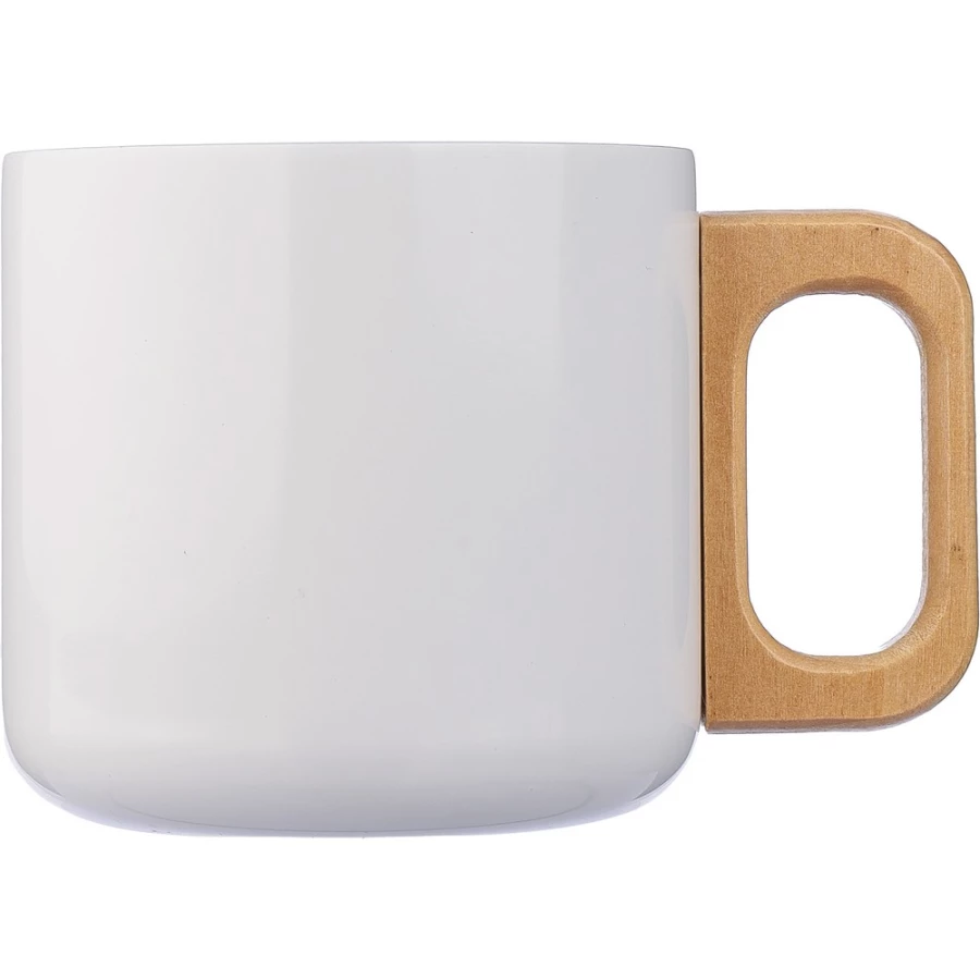 Kubek 400 ml posiada podwójne ścianki ze stali nierdzewnej z recyklingu, które chronią przed poparzeniem, solidny uchwyt z drewna, ikona stali nierdzewnej z recyklingu na produkcie, zapakowany w brązowy kartonik, produkt wykonany ze stali nierdzewnej