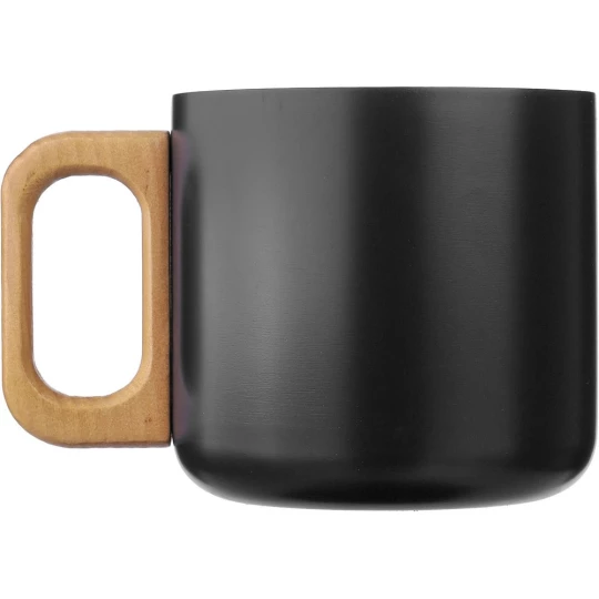 Kubek 400 ml posiada podwójne ścianki ze stali nierdzewnej z recyklingu, które chronią przed poparzeniem, solidny uchwyt z drewna, ikona stali nierdzewnej z recyklingu na produkcie, zapakowany w brązowy kartonik, produkt wykonany ze stali nierdzewnej