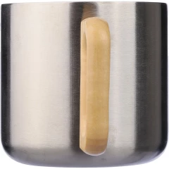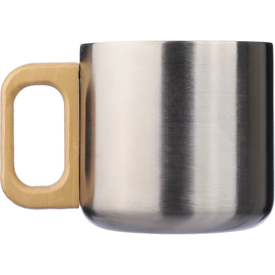 Kubek 400 ml posiada podwójne ścianki ze stali nierdzewnej z recyklingu, które chronią przed poparzeniem, solidny uchwyt z drewna, ikona stali nierdzewnej z recyklingu na produkcie, zapakowany w brązowy kartonik, produkt wykonany ze stali nierdzewnej