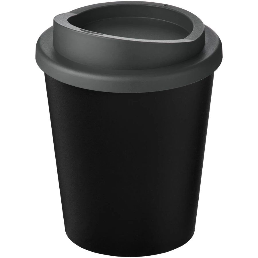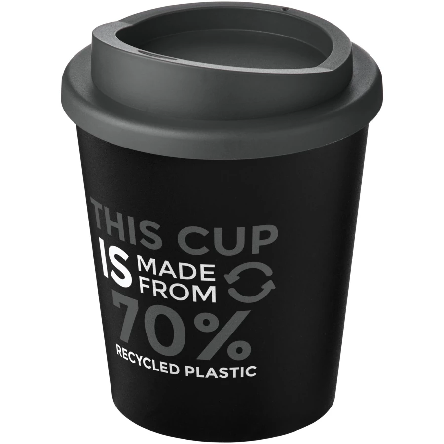 Kompaktowy, izolowany kubek o podwójnych ściankach z zakręcaną pokrywką. Mieści się w większości ekspresów do kawy. Kubek wykonany jest w 100% z polipropylenu z recyklingu, a pokrywka z polipropylenu klasy spożywczej. Ponieważ pokrywka nie jest wykonana z materiałów pochodzących z recyklingu, można ją zamówić w szerokiej gamie różnych kolorów. Kubek w pełni nadaje się do recyklingu. Odcienie czerni lub bieli mogą się różnić. W przypadku opcji białej występuje efekt tekstury kolorystycznej, co wynika z natury materiału pochodzącego z recyklingu. Pojemność 250 ml. Wyprodukowano w Wielkiej Brytanii. Zapakowany w torbę, którą można kompostować w domu. Produkt wolny od BPA. Można myć w zmywarce.