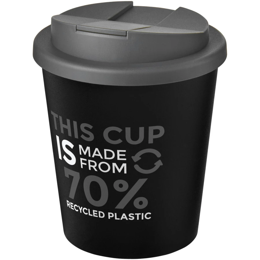 Dwuwarstwowy, izolowany kubek ze szczelną zakręcaną pokrywą odporną na zalanie. Pokrywa zamykana jest na zatrzask, aby lepiej zapobiegać rozlaniom i wykonana została bez użycia silikonu, dzięki czemu kubek w pełni nadaje się do recyklingu. Kubek wykonany jest w 100% z polipropylenu z recyklingu, a pokrywka z polipropylenu klasy spożywczej. Odcienie czerni lub bieli mogą się różnić. W przypadku opcji białej występuje efekt tekstury kolorystycznej, co wynika z natury materiału pochodzącego z recyklingu. Zgodny z EN12875-1; nadaje się do mycia w zmywarce oraz podgrzewania w kuchence mikrofalowej. Pojemność 250 ml. Dostarczany w torbie, którą można kompostować w domu. Wyprodukowano w Wielkiej Brytanii. Produkt wolny od BPA. Można myć w zmywarce.