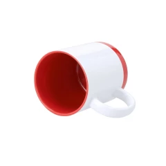 Kubek 350 ml, wnętrze kubka oraz ozdobny pasek w dopasowanym kolorze, nadaje się pod znakowanie metodą sublimacji, produktu nie należy myć w zmywarce, produkt wykonany z ceramiki