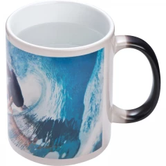 Efektowny kubek ceramiczny do sublimacji - kiedy jest zimny, nie widać nadruku, ale po wypełnieniu go ciepłym napojem reklama staje się widoczna. Zalecane mycie ręczne.