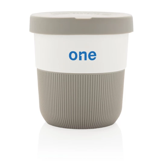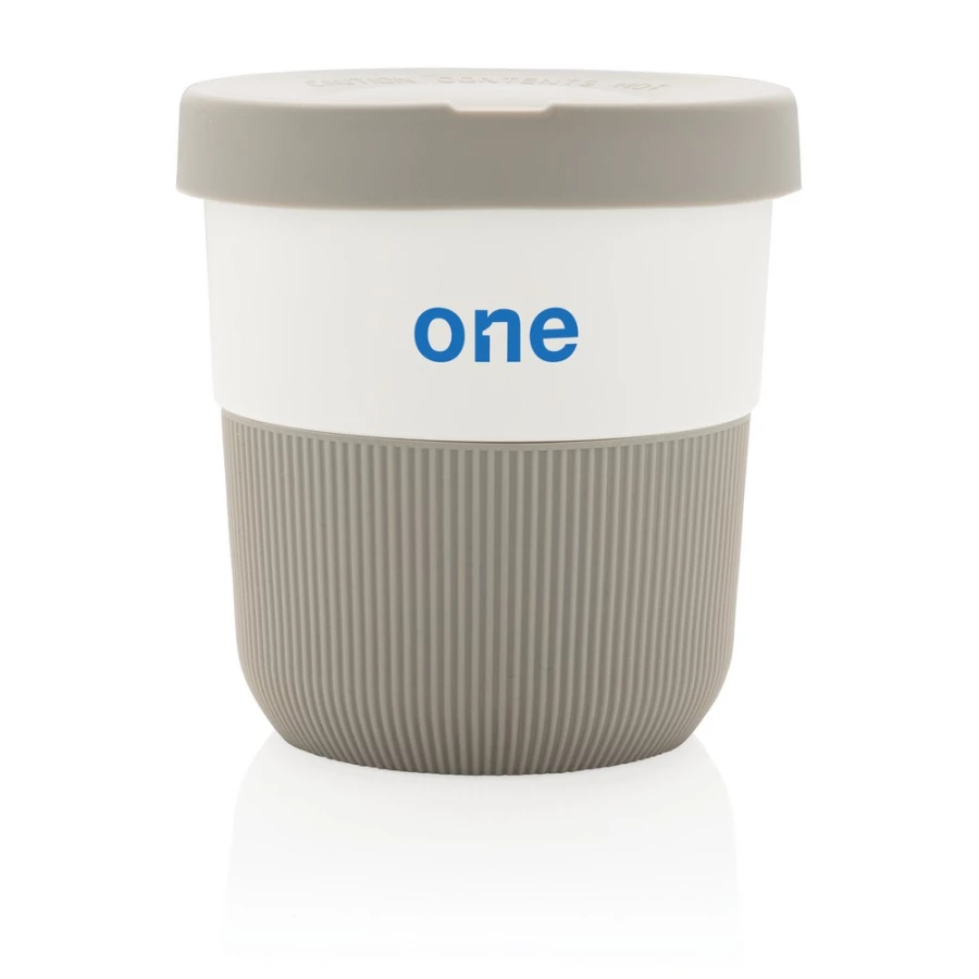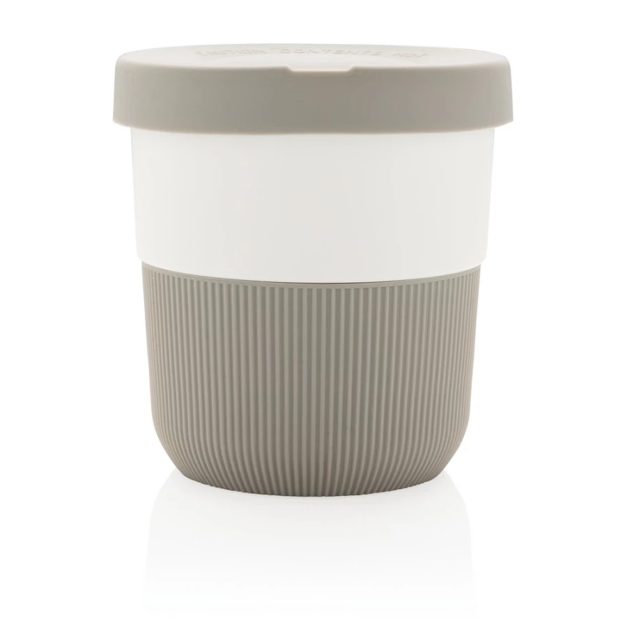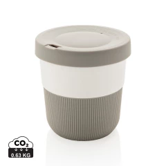 Kubek podróżny 250 ml, wykonany z PLA, silikonowe wieczko i uchwyt, pasuje do większości ekspresów do kawy, nie zawiera melaminy, ślad węglowy produktu: 0,63 kg CO2