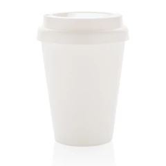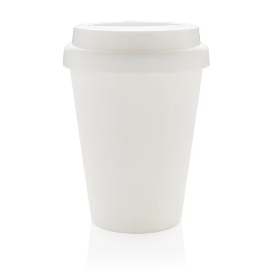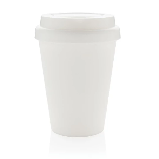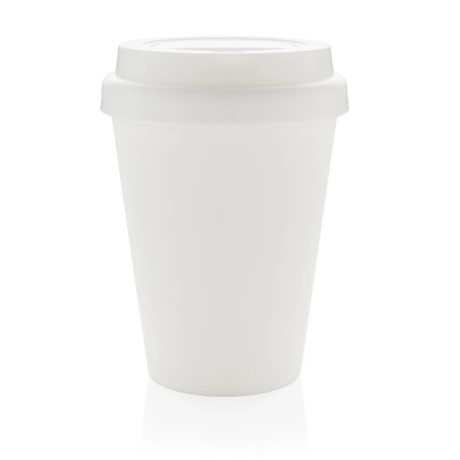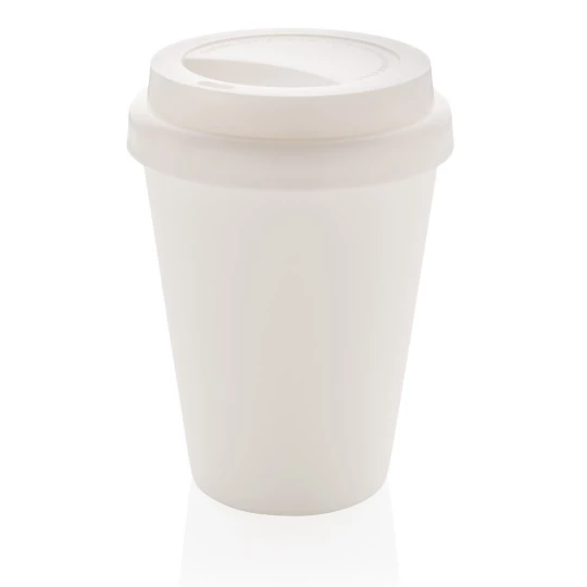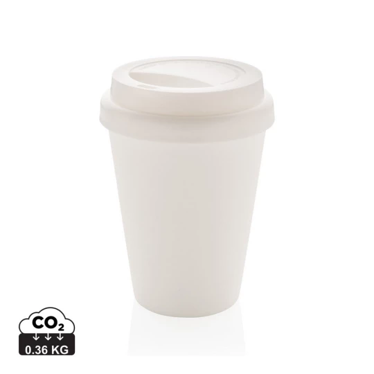 Kubek termiczny 300 ml, lekki, trwały i wielokrotnego użytku, wykonany z materiału PP w 100% nadającego się do recyklingu, podwójne ścianki, zakręcane wieczko, odporny na temperaturę do 100 stopni Celsjusza, wyłącznie mycie ręczne, ślad węglowy produktu: 0,36 kg CO2