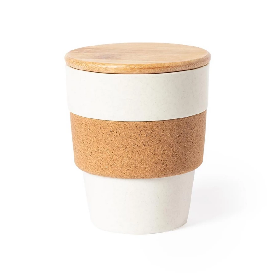 Kubek podróżny 350 ml z bambusowym wieczkiem i korkowym elementem, utrzymuje temperaturę napojów gorących do 4 godzin