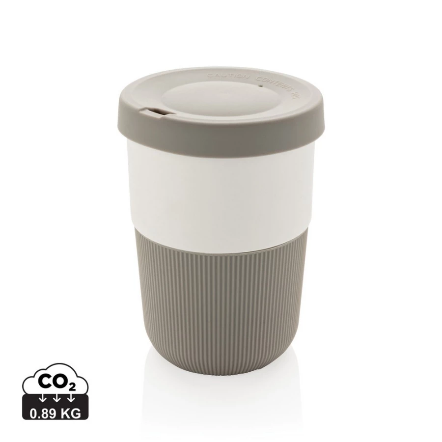 Kubek podróżny 380 ml, wykonany z PLA, silikonowe wieczko i uchwyt, nie zawiera melaminy, ślad węglowy produktu: 0,89 kg CO2