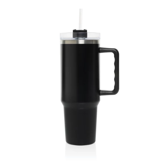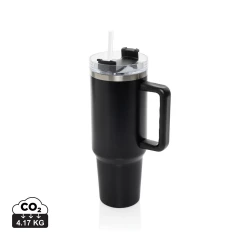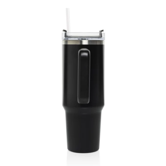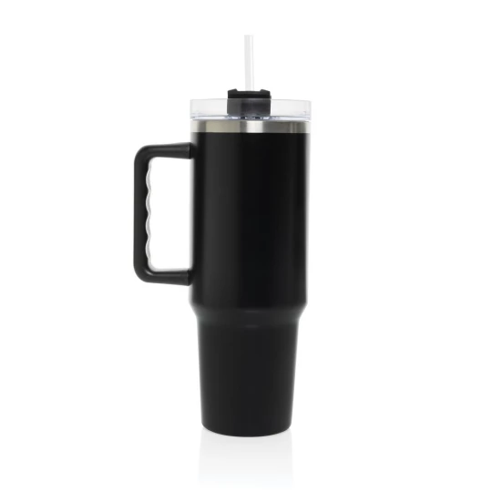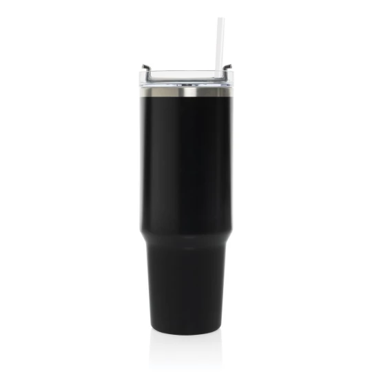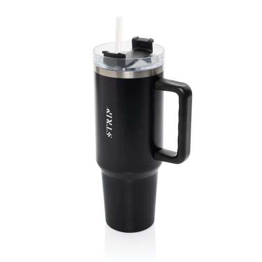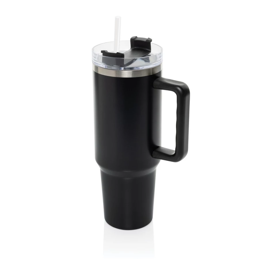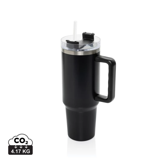 Kubek termiczny 1200 ml, podwójne ścianki z próżnią pomiędzy dzięki czemu kubek posiada funkcję termosu, posiada słomkę i szeroki otwór do picia, wykonany z materiałów z recyklingu, całkowita zawartość materiałów z recyklingu obliczona na podstawie wagi całkowitej produktu: 29%