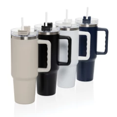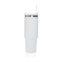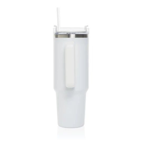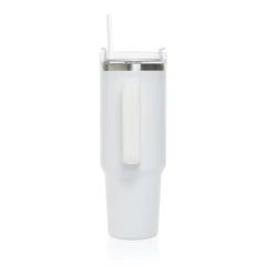 Kubek termiczny 1200 ml, podwójne ścianki z próżnią pomiędzy dzięki czemu kubek posiada funkcję termosu, posiada słomkę i szeroki otwór do picia, wykonany z materiałów z recyklingu, całkowita zawartość materiałów z recyklingu obliczona na podstawie wagi całkowitej produktu: 29%