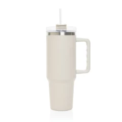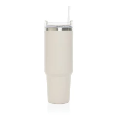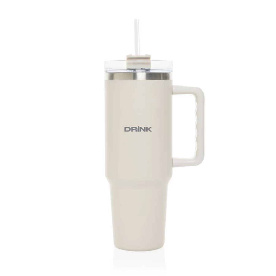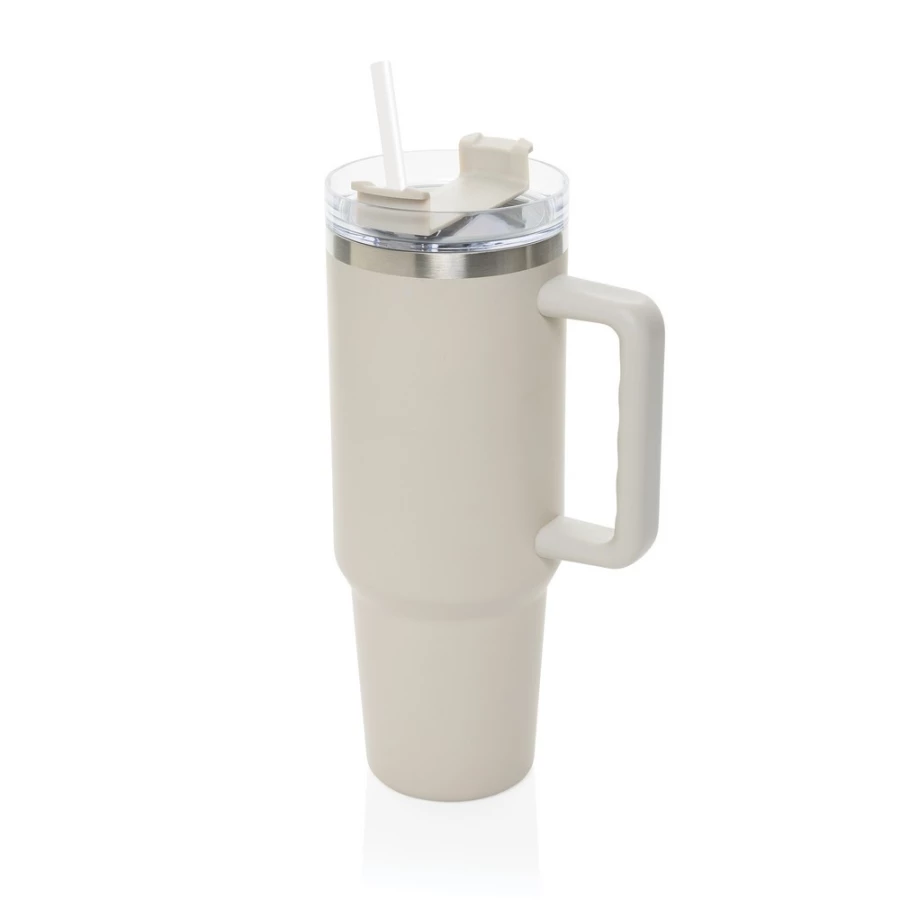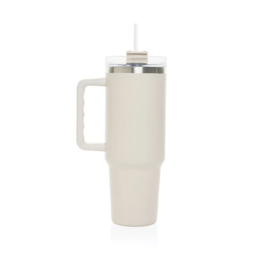 Kubek termiczny 1200 ml, podwójne ścianki z próżnią pomiędzy dzięki czemu kubek posiada funkcję termosu, posiada słomkę i szeroki otwór do picia, wykonany z materiałów z recyklingu, całkowita zawartość materiałów z recyklingu obliczona na podstawie wagi całkowitej produktu: 29%