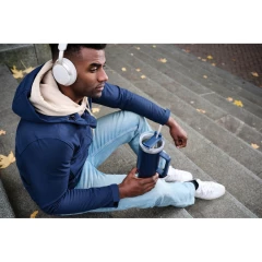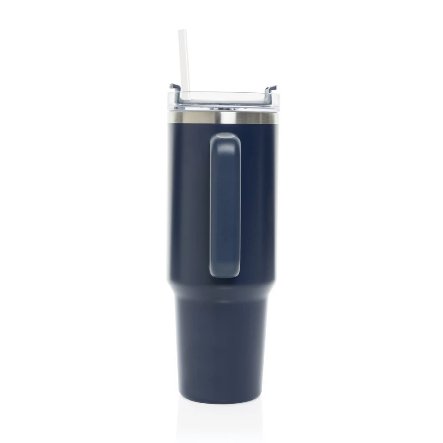 Kubek termiczny 1200 ml, podwójne ścianki z próżnią pomiędzy dzięki czemu kubek posiada funkcję termosu, posiada słomkę i szeroki otwór do picia, wykonany z materiałów z recyklingu, całkowita zawartość materiałów z recyklingu obliczona na podstawie wagi całkowitej produktu: 29%