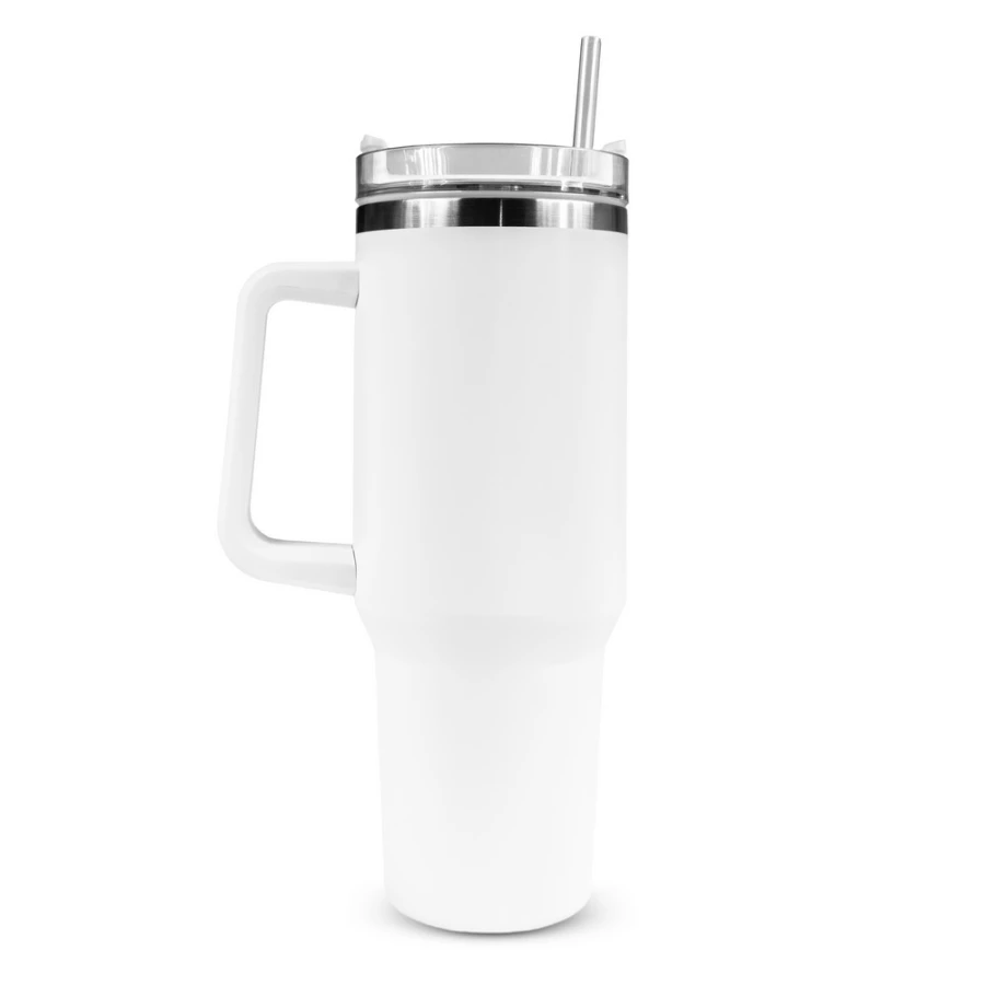 Kubek termiczny 1200 ml ze słomką i ergonomicznym uchwytem, posiada podwójne ścianki ze stali nierdzewnej z próżnią między ściankami, co spowalnia oddawanie temperatury na zewnątrz, zachowując funkcje termosu, produkt wykonany ze stali nierdzewnej i plastiku, utrzymuje temperaturę napojów gorących do 15 godzin, w opakowaniu wykonanym z kartonu kraftowego