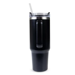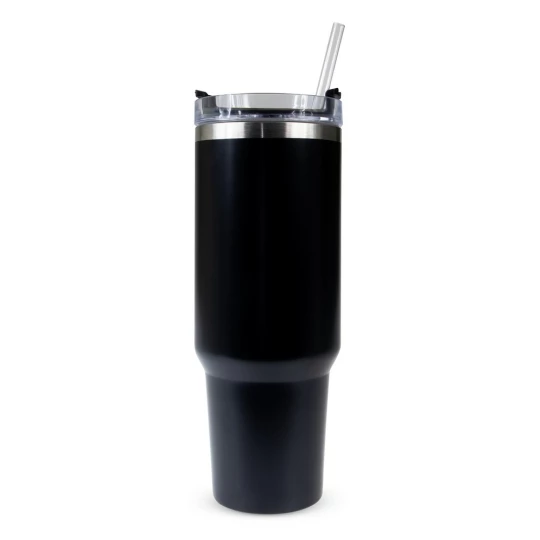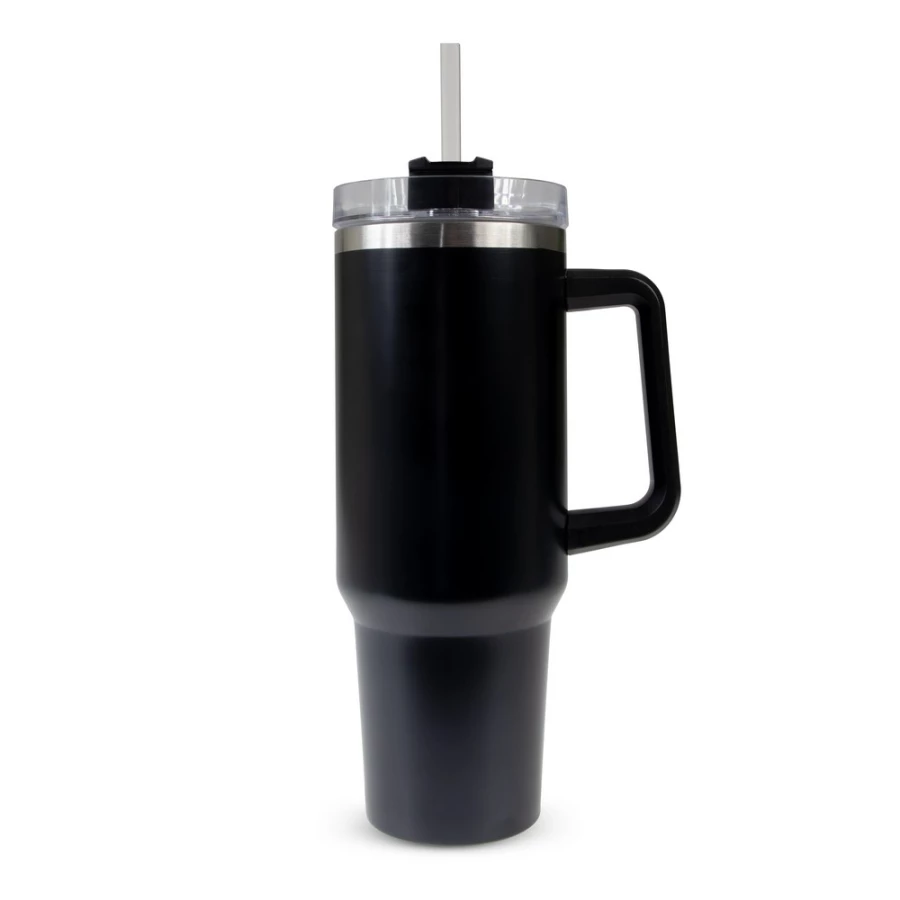 Kubek termiczny 1200 ml ze słomką i ergonomicznym uchwytem, posiada podwójne ścianki ze stali nierdzewnej z próżnią między ściankami, co spowalnia oddawanie temperatury na zewnątrz, zachowując funkcje termosu, produkt wykonany ze stali nierdzewnej i plastiku, utrzymuje temperaturę napojów gorących do 15 godzin, w opakowaniu wykonanym z kartonu kraftowego