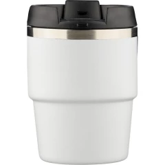 Kubek termiczny 175 ml, posiada podwójne ścianki ze stali nierdzewnej z próżnią między ściankami, co spowalnia oddawanie temperatury na zewnątrz, zachowując funkcje termosu, ikona recyklingu na produkcie, zapakowany pojedynczo w brązowe kartonowe pudełko, produkt wykonany z recyklingowej stali nierdzewnej (wewnątrz 304 / na zewnątrz 201) z pokrywką z PP, utrzymuje temperaturę napojów gorących do 4 godzin
