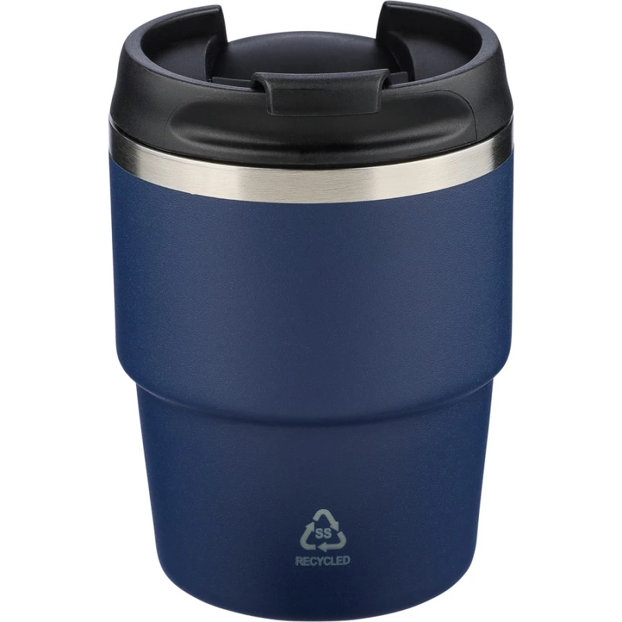 Kubek termiczny 175 ml, posiada podwójne ścianki ze stali nierdzewnej z próżnią między ściankami, co spowalnia oddawanie temperatury na zewnątrz, zachowując funkcje termosu, ikona recyklingu na produkcie, zapakowany pojedynczo w brązowe kartonowe pudełko, produkt wykonany z recyklingowej stali nierdzewnej (wewnątrz 304 / na zewnątrz 201) z pokrywką z PP, utrzymuje temperaturę napojów gorących do 4 godzin
