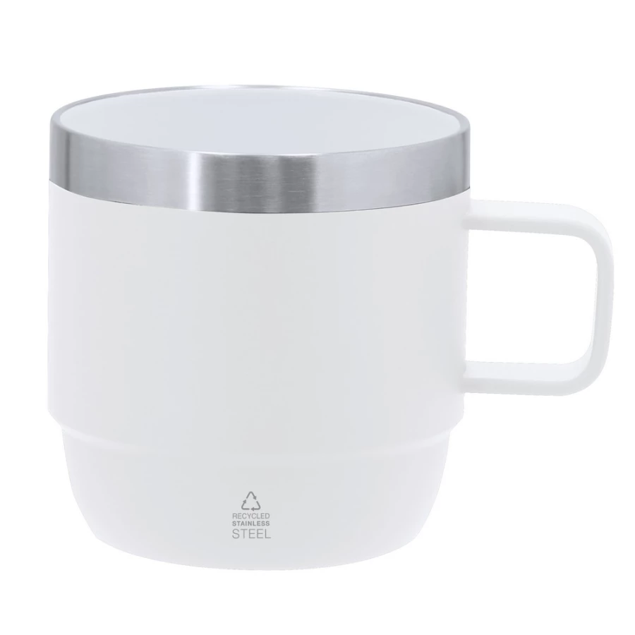 Kubek 180 ml z rączką, posiada ceramiczną powłokę wewnątrz oraz podwójne ścianki, które spowalniają oddawanie temperatury na zewnątrz, produkt wykonany z ceramiki i stali nierdzewnej z recyklingu