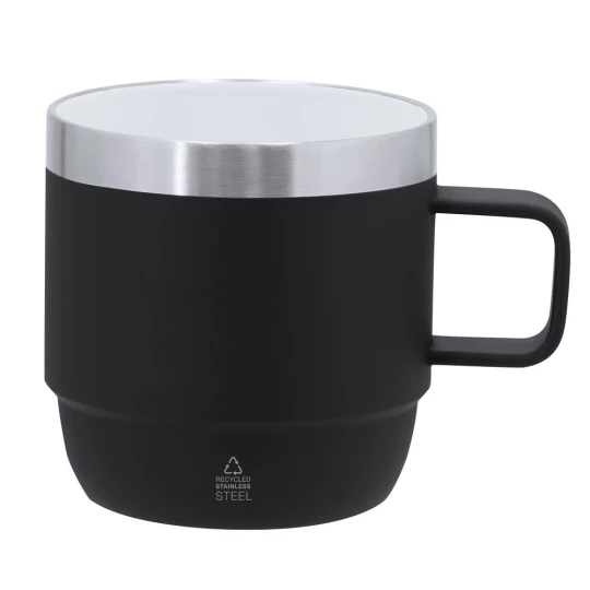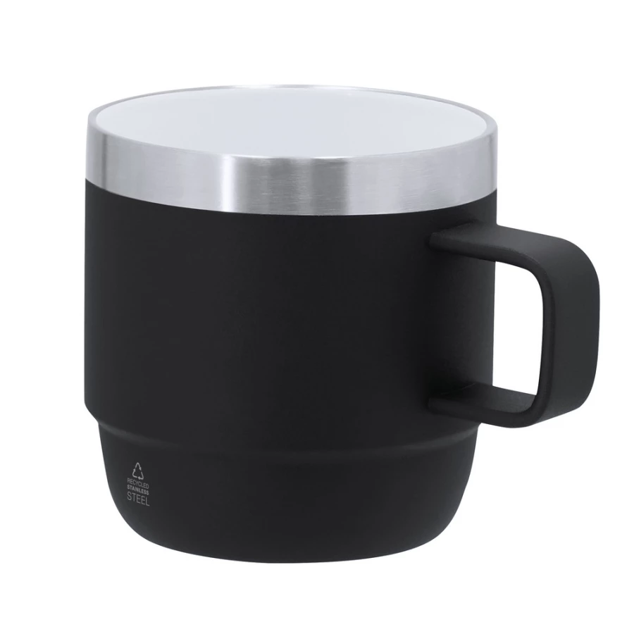 Kubek 180 ml z rączką, posiada ceramiczną powłokę wewnątrz oraz podwójne ścianki, które spowalniają oddawanie temperatury na zewnątrz, produkt wykonany z ceramiki i stali nierdzewnej z recyklingu