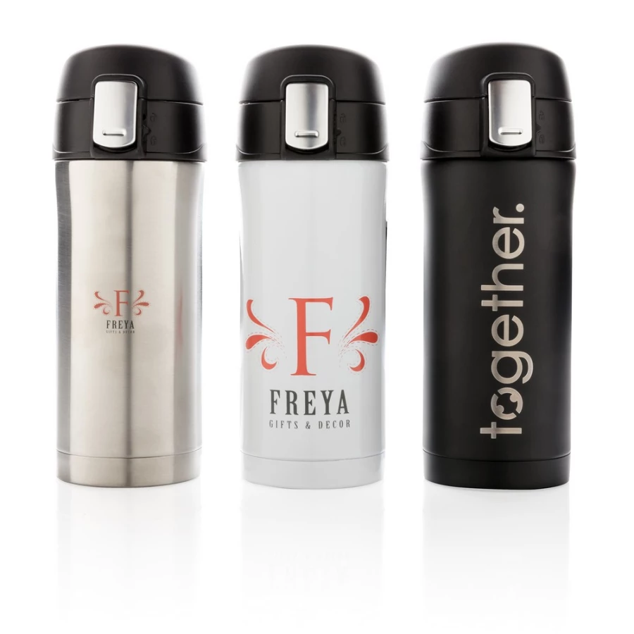Kubek termiczny 300 ml, podwójne ścianki ze stali nierdzewnej z próżnią pomiędzy, obsługa jedną ręką, wykonany z materiałów pochodzących z recyklingu z certyfikatem RCS, całkowita zawartość materiałów z recyklingu obliczona na podstawie wagi całkowitej przedmiotu: 71%, w pudełku z papieru kraftowego z certyfikatem FSC®, utrzymuje temperaturę napojów gorących do 20 godzin oraz zimnych do 15 godzin