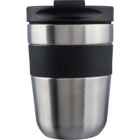Kubek termiczny 300 ml posiada podwójne ścianki ze stali nierdzewnej z próżnią między ściankami, co spowalnia oddawanie temperatury na zewnątrz, zachowując funkcje termosu, silikonowy uchwyt zwiększający wygodę użytkowania, zapakowana w brązowy kartonik, produkt wykonany ze stali nierdzewnej, PP, silikonu