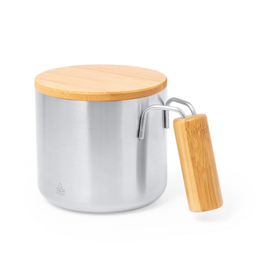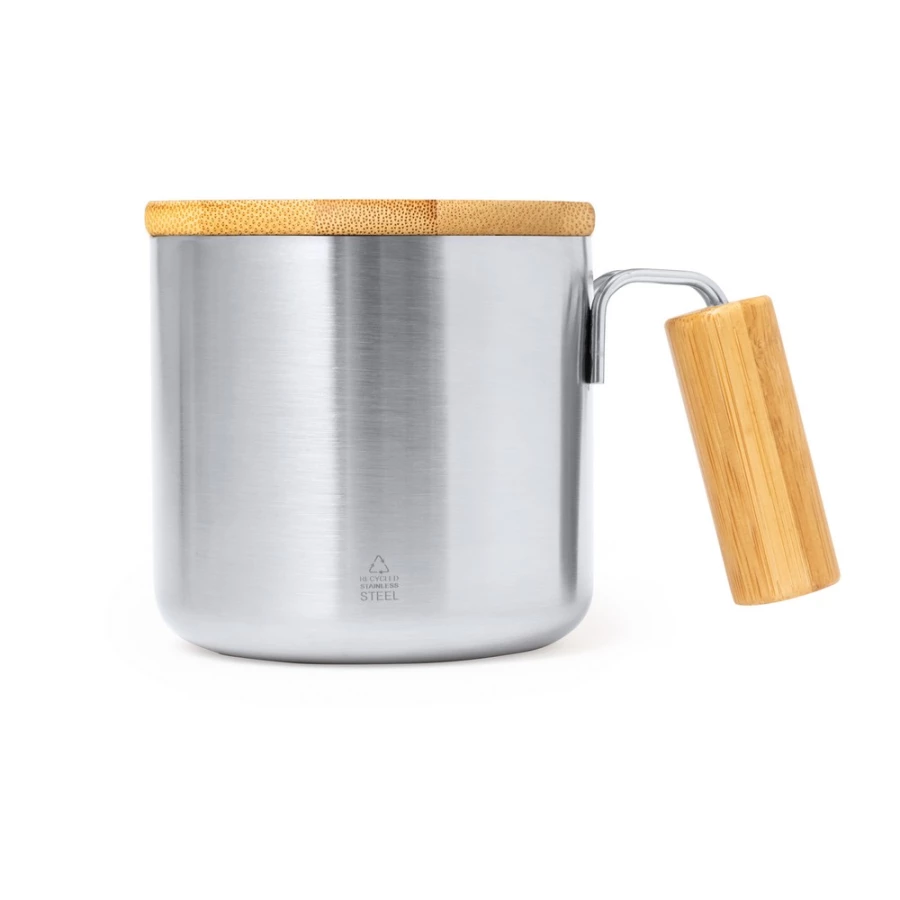 Kubek termiczny 330 ml wykonany ze stali nierdzewnej z recyklingu, bambusowe wieczko i uchwyt, podwójne ścianki