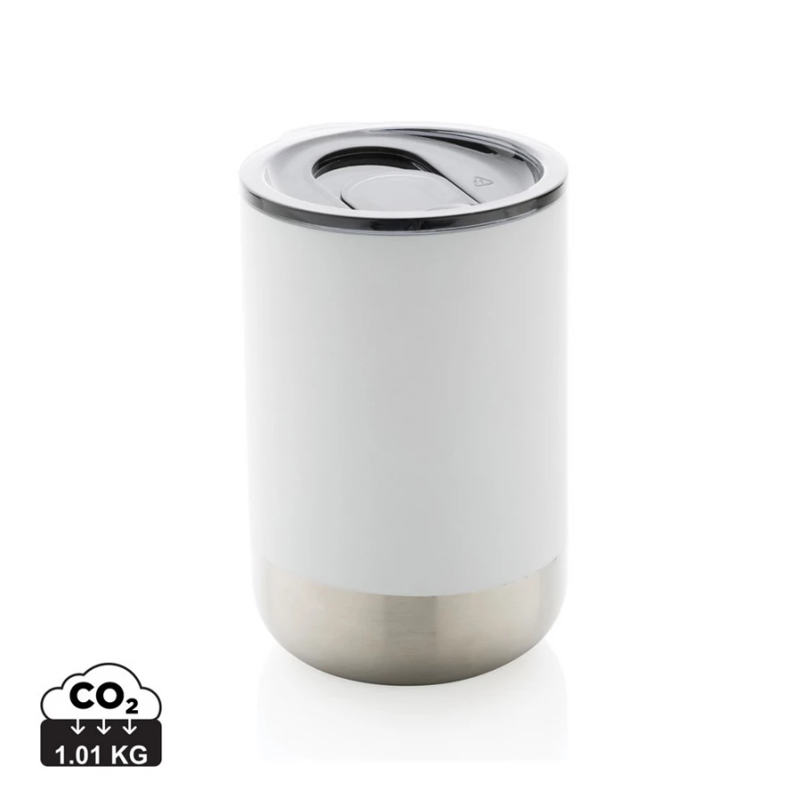 Kubek termiczny 360 ml, podwójne ścianki z próżnią pomiędzy, utrzymuje temperaturę napojów ciepłych do 3 godzin oraz zimnych do 6 godzin, wieczko zapobiegające rozlewaniu, wykonany ze stali nierdzewnej z recyklingu z certyfikatem RCS (Recycled Claim Standard) który gwarantuje, że wykorzystane materiały pochodzą z recyklingu, całkowita zawartość materiału z recyklingu obliczona w oparciu o wagę całkowitą przedmiotu: 83%, w pudełku z papieru kraftowego z certyfikatem FSC® (Forest Stewardship Council), ślad węglowy produktu: 1,01 kg CO2