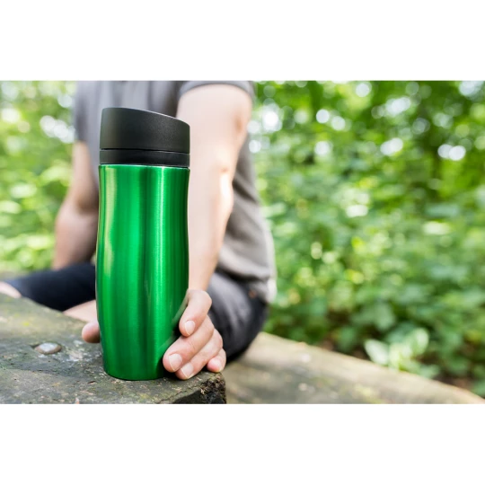 Kubek termiczny 375 ml Air Gifts, posiada podwójne ścianki ze stali nierdzewnej z miedzianą izolacją próżniową, co spowalnia oddawanie temperatury na zewnątrz, zachowując funkcje termosu, plastikowe wieczko z przyciskiem otwarcia/zamknięcia ustnika umożliwiającym obsługę jedną ręką, błyszczące wykończenie, utrzymuje temperaturę napojów gorących do 20 godzin +leakproof