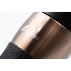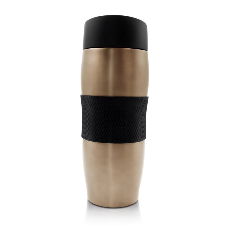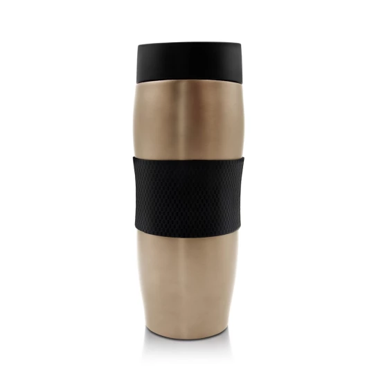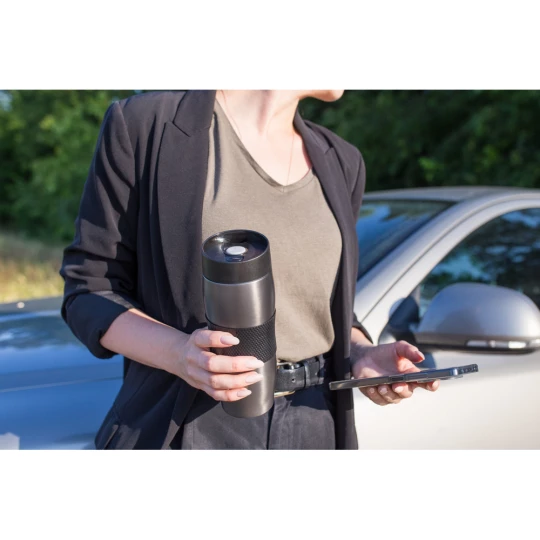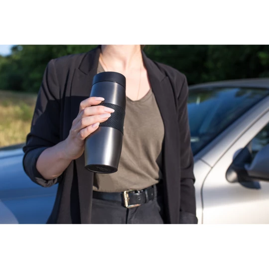 Kubek termiczny 375 ml Air Gifts, posiada podwójne ścianki ze stali nierdzewnej z miedzianą izolacją próżniową, co spowalnia oddawanie temperatury na zewnątrz, zachowując funkcje termosu, plastikowe wieczko z przyciskiem otwarcia/zamknięcia ustnika umożliwiającym obsługę jedną ręką, gumowy uchwyt zwiększający wygodę użytkowania, półmatowe wykończenie, utrzymuje temperaturę napojów gorących do 15 godzin +leakproof