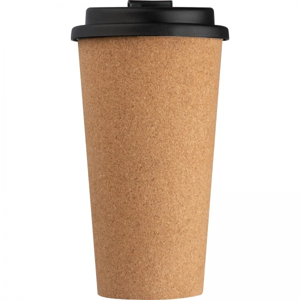 Kubek z plastiku o podwójnych ściankach w korkowej obudowie, posiada zamykany ustnik, pojemność 400 ml.