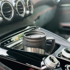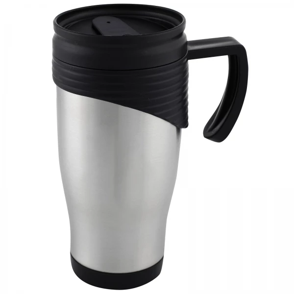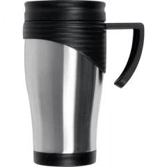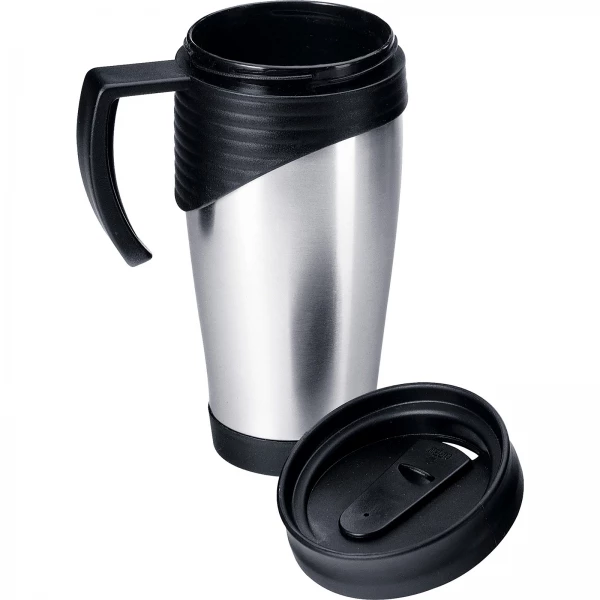 Kubek termiczny o podwójnych ściankach (izolacja próżniowa), o pojemności 400 ml, wykonany ze stali nierdzewnej z zewnątrz i plastiku w środku.