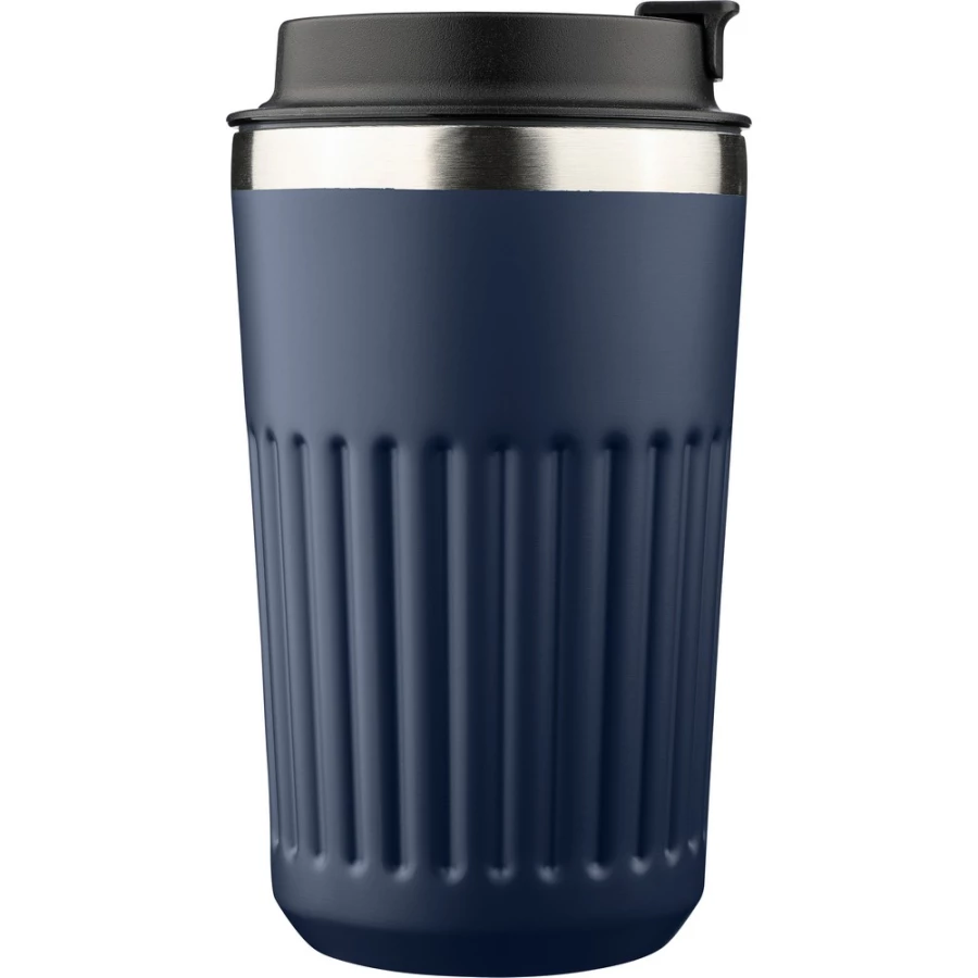 Kubek termiczny 400 ml, posiada podwójne ścianki ze stali nierdzewnej z próżnią między ściankami, co spowalnia oddawanie temperatury na zewnątrz, zachowując funkcje termosu, ikona recyklingu na produkcie, zapakowany w brązowy kartonik, produkt wykonany ze stali nierdzewnej (304 w środku i 201 na zewnątrz), silikonu i PP