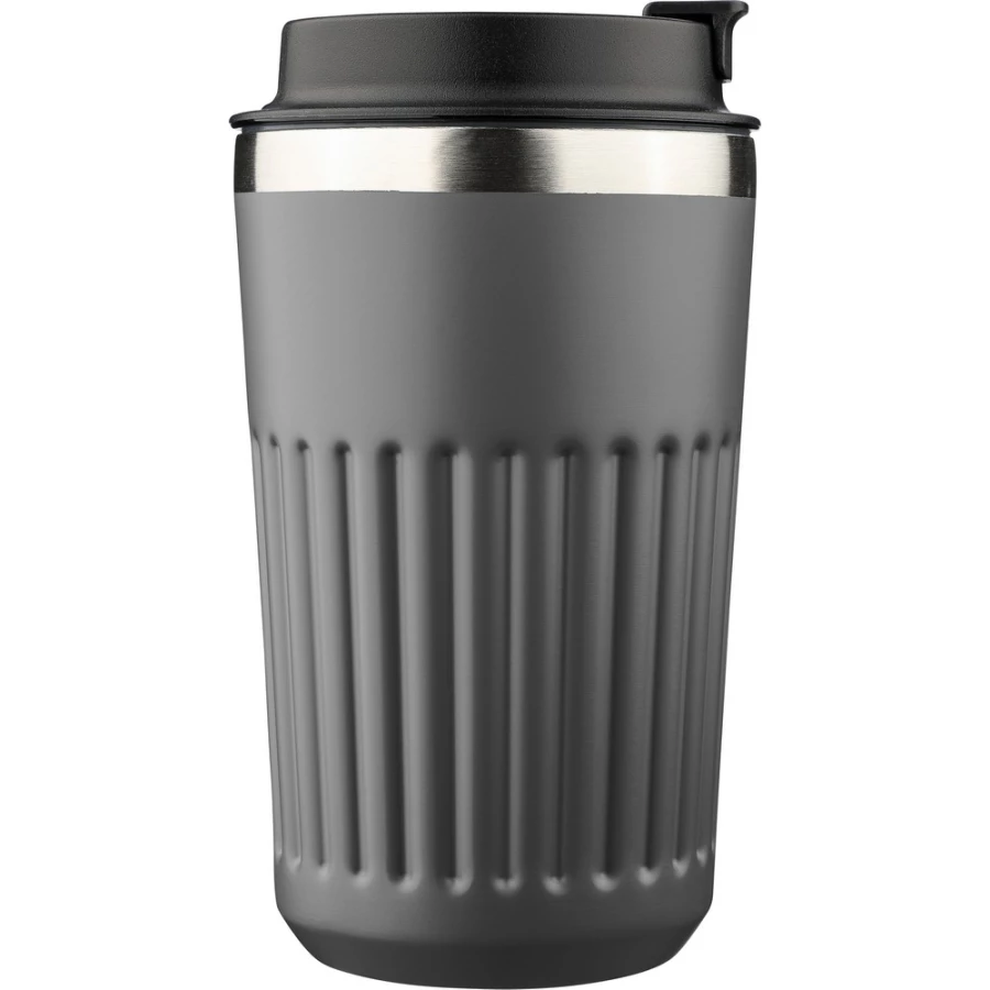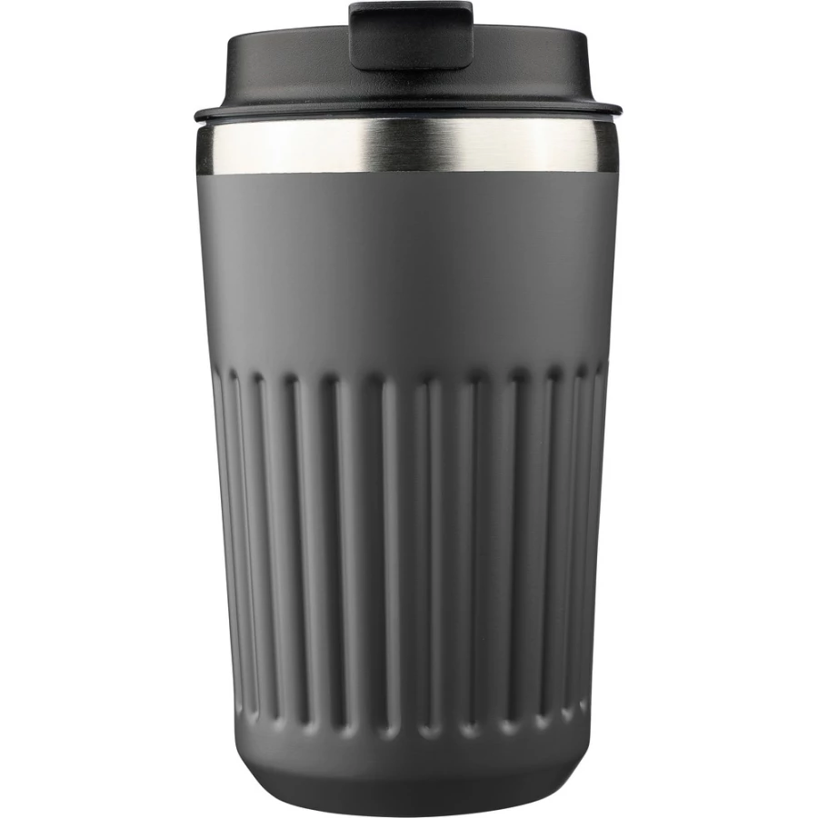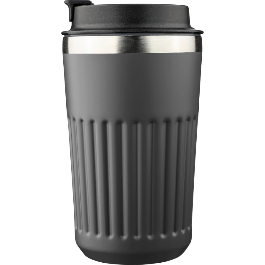 Kubek termiczny 400 ml, posiada podwójne ścianki ze stali nierdzewnej z próżnią między ściankami, co spowalnia oddawanie temperatury na zewnątrz, zachowując funkcje termosu, ikona recyklingu na produkcie, zapakowany w brązowy kartonik, produkt wykonany ze stali nierdzewnej (304 w środku i 201 na zewnątrz), silikonu i PP