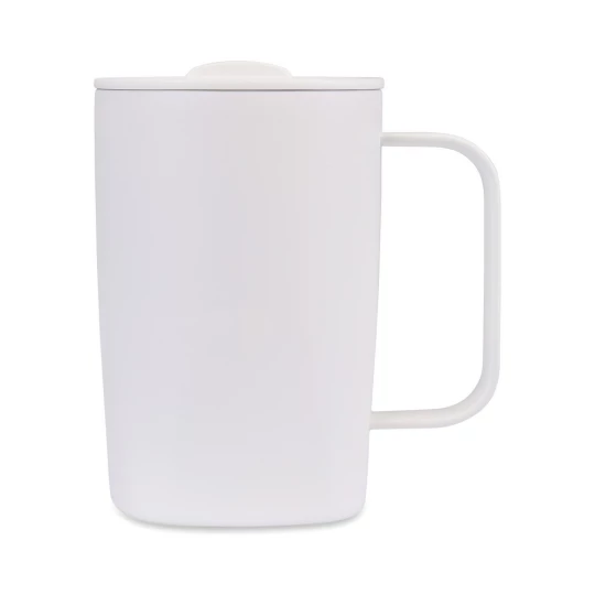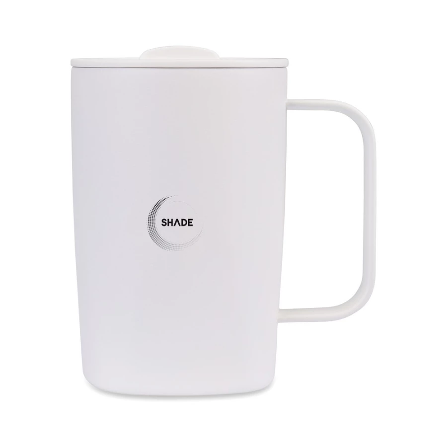 Kubek termiczny 450 ml, posiada podwójne ścianki ze stali nierdzewnej z próżnią między ściankami, co spowalnia oddawanie temperatury na zewnątrz, zachowując funkcje termosu, wykonany z materiałów z recyklingu
