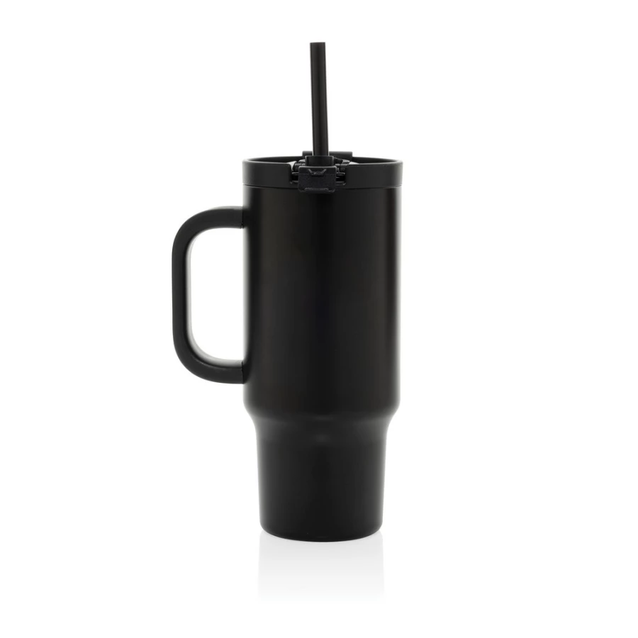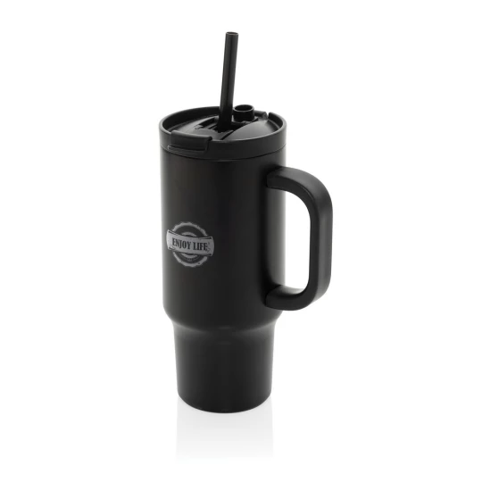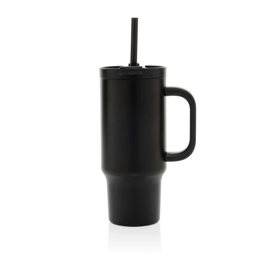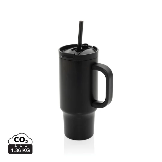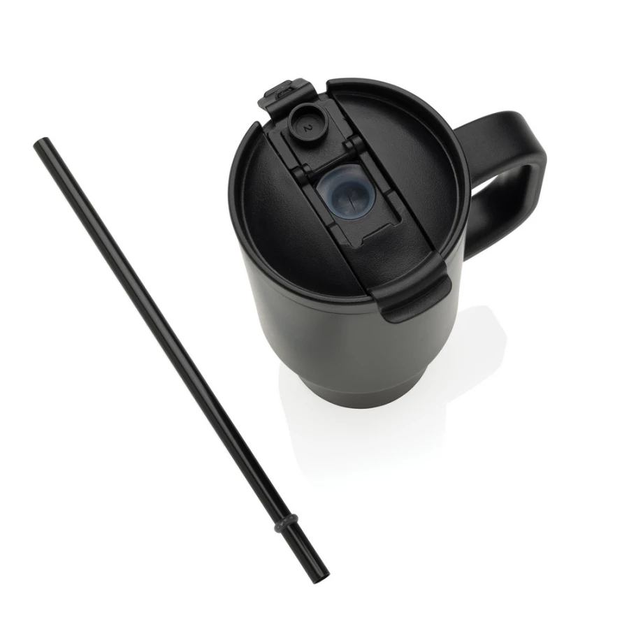 Kubek termiczny 480 ml, podwójne ścianki z próżnią pomiędzy dzięki czemu kubek posiada funkcję termosu, posiada słomkę i szeroki otwór do picia, wykonany z materiałów z recyklingu, całkowita zawartość materiałów z recyklingu obliczona na podstawie wagi całkowitej produktu: 73%