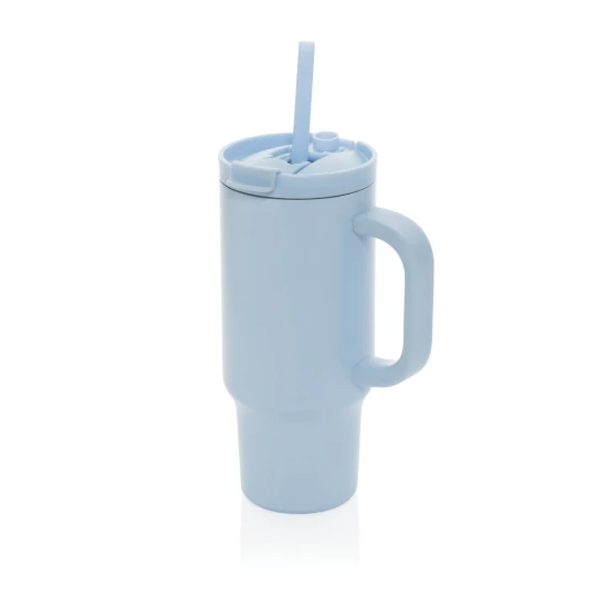 Kubek termiczny 480 ml, podwójne ścianki z próżnią pomiędzy dzięki czemu kubek posiada funkcję termosu, posiada słomkę i szeroki otwór do picia, wykonany z materiałów z recyklingu, całkowita zawartość materiałów z recyklingu obliczona na podstawie wagi całkowitej produktu: 73%