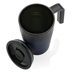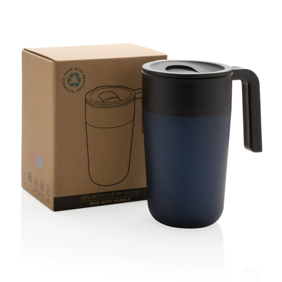 Kubek termiczny 480 ml z uchwytem, szczelne wieczko, wykonany z PP z recyklingu i stali nierdzewnej z recyklingu z certyfikatem GRS (Global Recycled Standard) który gwarantuje, że wykorzystane materiały pochodzą z recyklingu, całkowita zawartość materiału z recyklingu obliczona w oparciu o wagę całkowitą przedmiotu: 60%, w pudełku z papieru kraftowego z certyfikatem FSC® (Forest Stewardship Council), utrzymuje temperaturę napojów gorących do 4 godzin