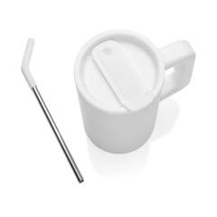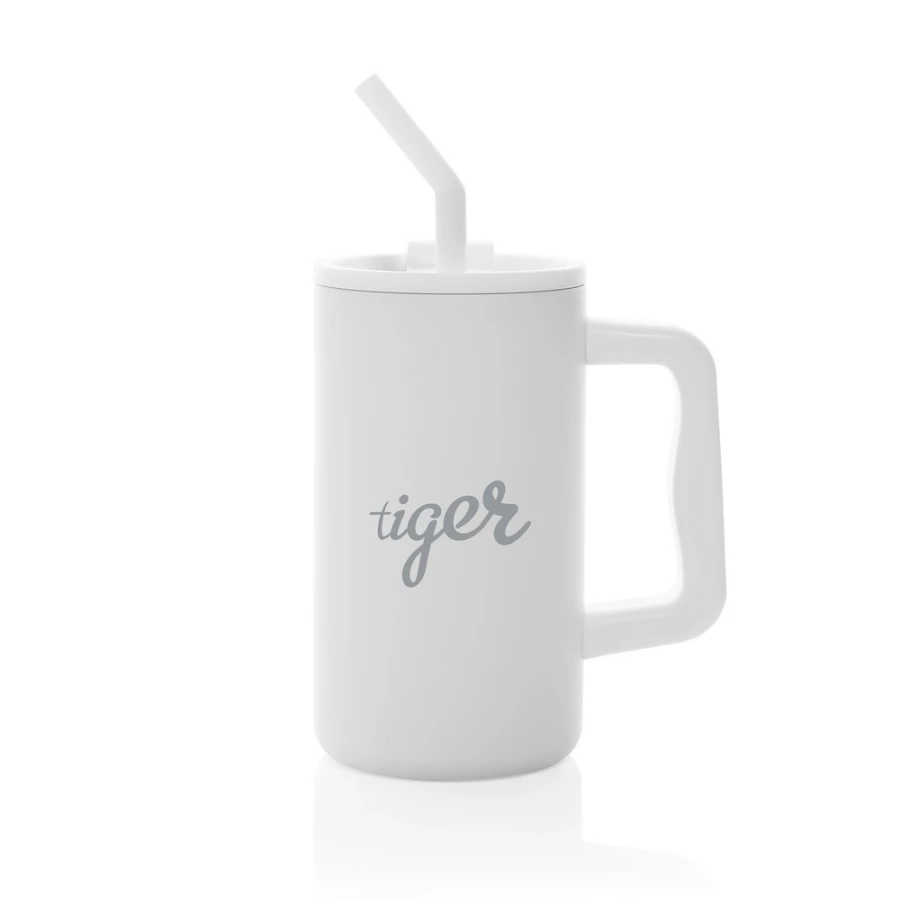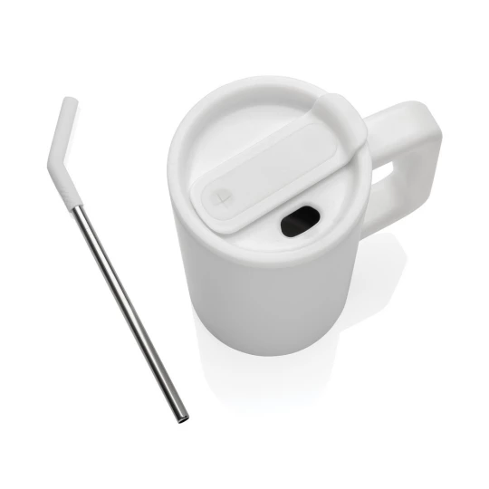Kubek termiczny 800 ml, posiada słomkę z silikonową nakładką, zakręcane wieczko, wykonany ze stali nierdzewnej z recyklingu, podwójne ścianki ze stali nierdzewnej z próżnią między ściankami, dzięki czemu zachowuje funkcje termosu i długo utrzymuje temperaturę nie oddając jej na zewnątrz, zalecane mycie ręczne