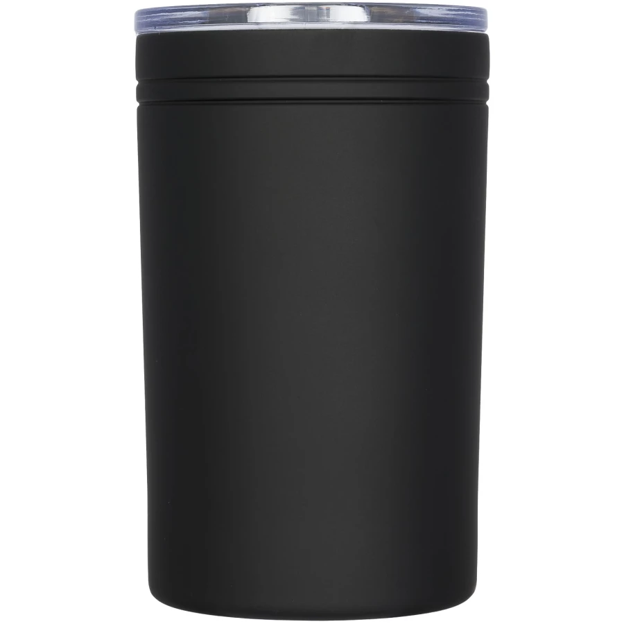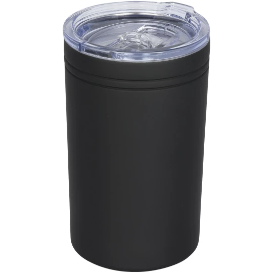Kubek o podwójnych ściankach, izolowany próżniowo. Przeźroczyste, wciskane wieczko z przesuwanym zamknięciem. Działa jak kubek lub termos. Pojemność 330ml.