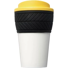 Dwuwarstwowy, izolowany kubek z zakręcaną pokrywą odporną na zalanie, z uchwytem stylizowanym na oponę. Zewnętrzna warstwa kubka wykonana jest z tworzywa sztucznego pochodzącego z recyklingu. Kubek charakteryzuje się pełnokolorowym, zawijanym wzorem dopasowanym do produktu, dzięki czemu jest trwały. Zgodny z EN12875-1; nadaje się do mycia w zmywarce oraz podgrzewania w kuchence mikrofalowej. Pojemność wynosi 350 ml. Mieszaj i łącz kolory, aby stworzyć idealny kubek. Skontaktuj się z działem obsługi klienta, aby uzyskać informacje o dodatkowych opcjach kolorystycznych. Wykonano w Wielkiej Brytanii. Produkt wolny od BPA. Można myć w zmywarce.