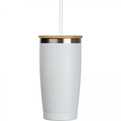 Kubek termiczny 500 ml wykonany ze stali nierdzewnej z izolacją termiczną, bambusową pokrywką i słomką z tworzywa sztucznego.