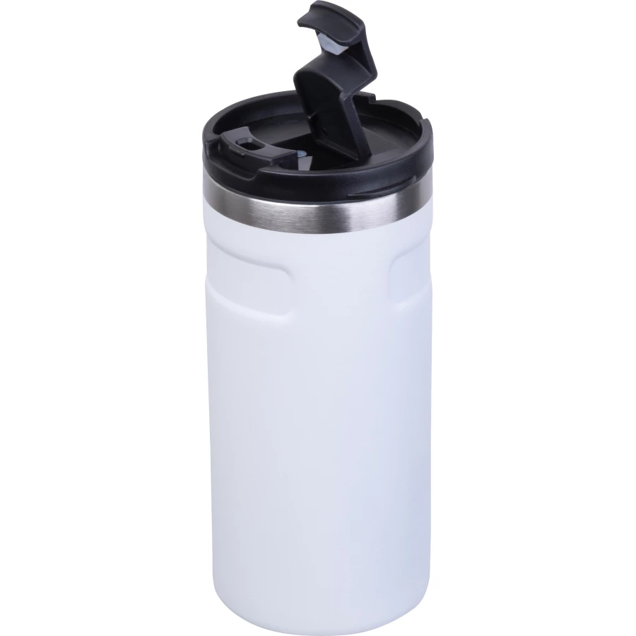Kubek do picia o pojemności 450 ml, z podwójnymi ściankami, wykonany ze stali nierdzewnej z recyklingu, wyposażony w szczelne, zapobiegające wyciekom zamknięcie.